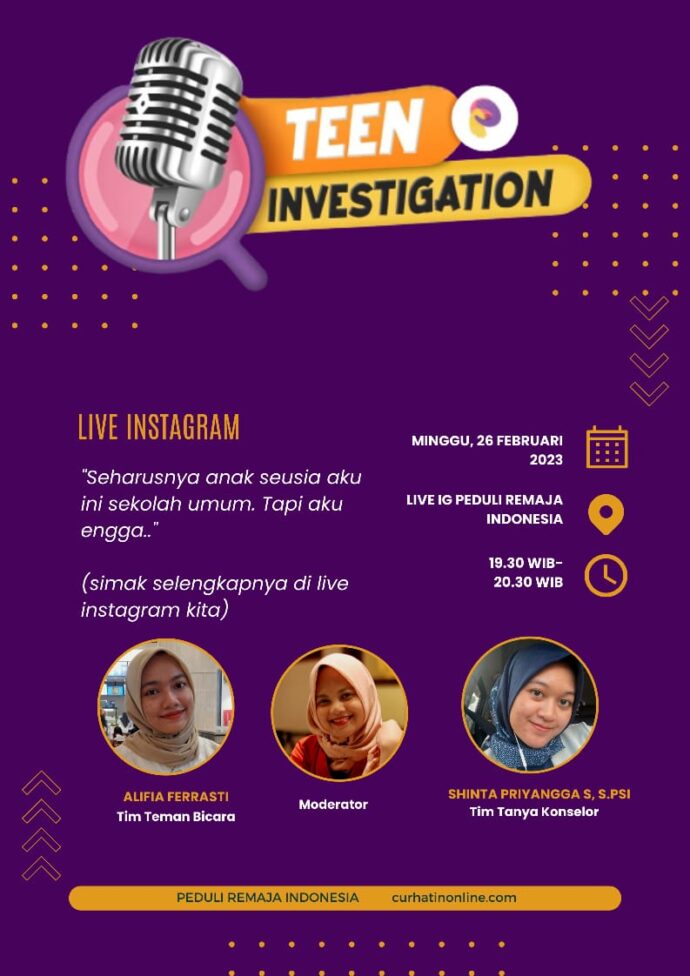 Teen Investigation bunda–Events–February 25, 2023February 25, 2023 “Seharusnya anak seusia aku ini sekolah umum. Tapi aku engga…” Kalian bisa simak selengkapnya di Teen Investigation kita episode ke-3!! […]